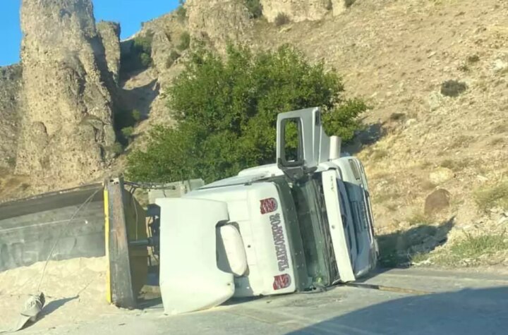 Ankara'nın Sincan ilçesinde şoförünün direksiyon hakimiyetini kaybetmesi sonucu kum yüklü hafriyat kamyonu devrildi. Kaza...